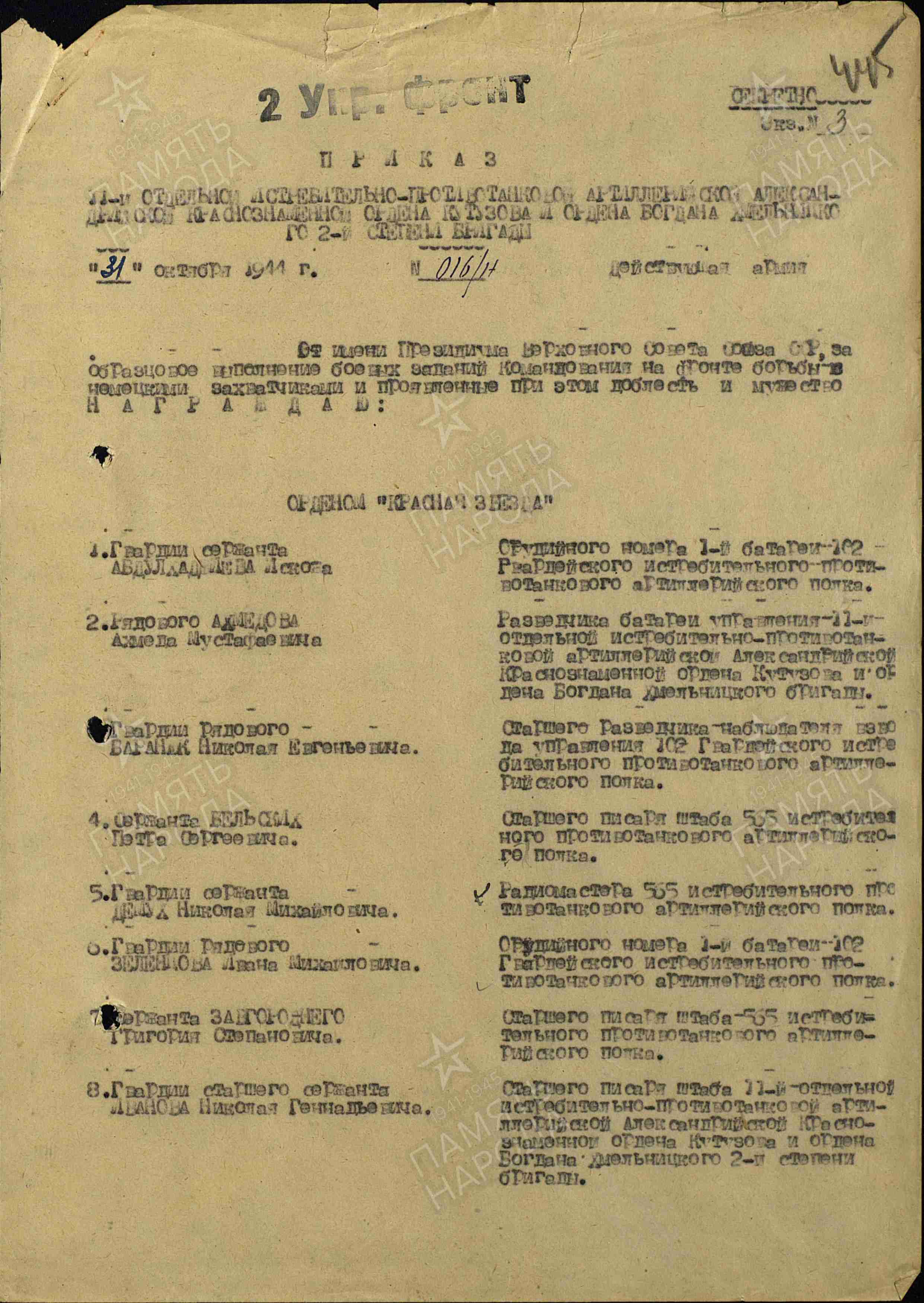 - Место призыва: Ново-Анненский РВК, Сталинградская обл., Ново-Анненский р-н